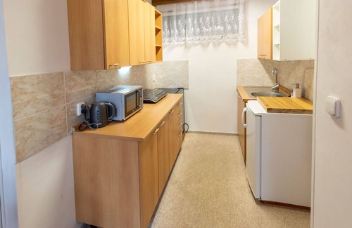 You will enjoy staying in the 2-room "Zimořský domek" house during your vacation. It is spread across two levels, with an open living/sleeping room on the ground floor that features a double bed, dining table, and TV. The upper floor also has a living/sleeping room with another double bed and TV.