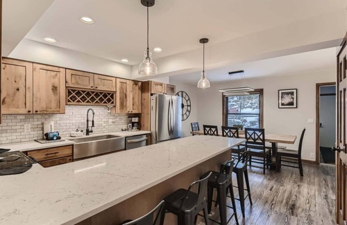 The home’s spacious kitchen is all at once modern, rustic, and beautifully functional with stainless steel appliances, coffee maker, and toaster for convenient meals at home. Share drinks and snacks at the breakfast bar with seating for 4, or head to the dining table for formal meals where 10 people can be comfortably seated.