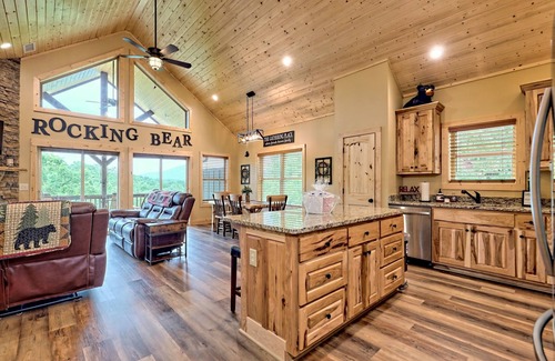 The main level hosts a master bedroom with an attached master bathroom showcasing a walk-in shower, a king guest bedroom, another full bathroom, a gourmet kitchen, and a living room with a gas fireplace. Slide open the door to the expansive porch adorned with rocking chairs, a picnic table, and your very own private hot tub, offering an ideal spot for relaxation and breathtaking views. Venture down to the terrace level, where you'll find an additional king bedroom, a room with two twins, a full bathroom, and a game room. Test your skills at a game of pool while enjoying sports or your favorite movie, or step out onto the lower deck to revel in more mesmerizing mountain views. At Rocking Bear Cabin, every detail is thoughtfully crafted to ensure your mountain retreat is nothing short of extraordinary.