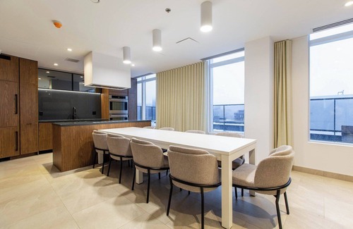 The fully equipped kitchen is outfitted with sleek, modern appliances and all the essentials you need—whether you're preparing a quiet dinner at home or entertaining friends.