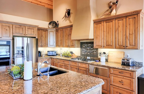 Upon entering, guests will discover an open and spacious great room which features a wall of windows that bring the great outdoors inside, vaulted wood tongue and groove ceilings, stone crafted fireplace, hardwood flooring , and entertainment area with large flat screen TV with popular streaming apps and YouTube TV that offers more than 100 channels including: local stations, sports channels, and premium networks such as Cinemax, HBO, Showtime, and Starz!!! The formal dining area has a rustic wood table and leads to the fully stocked Gourmet Kitchen with granite counter tops and stainless steel appliances. Additional areas include a breakfast nook and a twenty foot handcrafted Juniper wood bar!