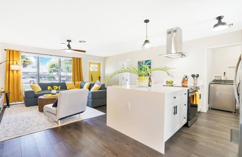 Step inside to a bright, modern home filled with natural light and sunny yellow accents for that perfect Florida feel. The open-concept living area connects the kitchen, dining, and living rooms — ideal for family gatherings and group hangouts.