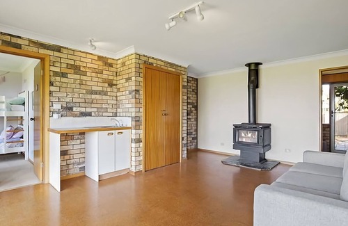 Living and entertaining space: Relax out on the front balcony and enjoy simply stunning views over the beach and ocean. It's the perfect spot to sit back with a coffee and soak up the views and that fresh, salty breeze, while contemplating the days activities. There is an open plan lounge/dining upstairs with wood burning fire for those cold winter nights. Another living area downstairs has a wood burner. The kitchen is fully equipped with a fridge/freezer, oven and microwave.
