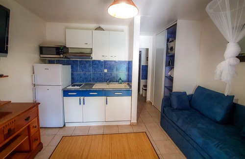 Located in a small secure tourist residence, 20 meters from the beach of Petit-Havre in Le Gosier, in a calm and flowery environment, the Manin apartment of the Residence "BLEU MARINE" on the ground floor, includes: an air-conditioned bedroom (double bed, sheets and towels provided), bathroom (large Italian shower) / WC, a living room with a real convertible sofa bed and a fan / fogger, TV (satellite channels), DVD player, free broadband WIFI. Equipped kitchen area: fridge / freezer, microwave-grill oven, Senseo coffee machine. A common washing machine (5 € / detergent). Sheets + cradle, high chair and baby bath provided. Swimming pool, Barbecue, Parking.