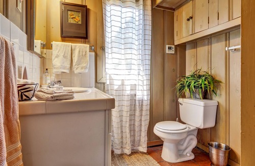 There are 2 bathrooms, one with shower and the other with shower over tub. Additionally, there is a dining room with fireplace and view . The cottage is private and set well away from the main house. It shares use of the pool, hot tub and outdoor entertainment area(kitchen, fireplace, bath and waterfall) with the main house. You are surrounded by redwoods and oaks. The property has a 'Zen' like feeling. When you drive down the driveway you feel you are out in the country, yet you are only minutes from downtown Oakland and SFO. Wildlife abounds. Hiking, biking and horseback riding trails are nearby. A perfect place to unwind.