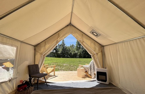 The Goose campsite is located 0.72 miles from the front entry gate. It sleeps up to 6 campers - two on the Queen bed in the 10 x 12 platform safari tent and up to 4 additional campers in the included pop-up tent. The site also comes with a picnic table, fire pit, and Adirondack chairs where you can kick back and take in the stars at night. Our campsite is also pet-friendly with a small pet fee.