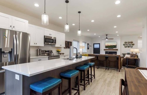 This brand-new home is fully furnished with high-end modern amenities and your group will have everything you need to come and go with ease. There are device charging stations in every room. You'll enjoy two separate living areas with TVs and couches in each so that your group can split up however you need to. Downstairs, there are games and activities for everyone to enjoy.