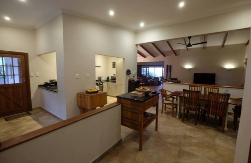 Lovely thatched beach-house with pool overlooking the Indian Ocean on the Dolphin Coast with direct beach access through garden. The house is well situated, close to Durban (75km north of Durban) in Blythedale Beach, 45 minute drive from King Shaka airport, 30 minutes from Ballito and 2 hours drive from several popular wildparks (Hluluwe-Umfolozi –big five, St.Lucia, Mkuzi). Our house caters for 10 people and has 5 bedrooms, 4 in house and 1 in flatlet. The main house has two large master en-suite bedrooms with bathrooms with direct sea view and two bedrooms at back and side of house (2 single beds and queen bed) sharing a bathroom. Flatlet on side has one bedroom, small separated sitting area, bathroom and small kitchen. Main house kitchen is fully equipped with dishwasher, dryer, gas/electricity stove, double door fridge with freezer and microwave. Ample of small kitchen ware and electrical utenzils are available. House has been completely renovated in 2018. Windows, tiles, bathrooms and kitchen have been completely removed in 2018. Babycod and chair are available upon request. House comes with 5 hour daily maid service, gardening and pool service. If needed , for extra cost, maid can provide breakfast and dinner. Linen, towels as well as DStv. are included in price. 5 hour cleaning service is included in price, when extra service is needed will be charged at 50R per hour. House is secured with indoors alarm, with several outside beams around house and garden and outside CCTV cameras. Garage holds 2 cars and is served with remote.