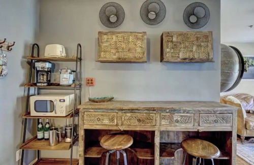 Remodeled Sept 2020 - All of our creativity and love went into making The Aether a unique and luxurious getaway. We decided to create a twist on the port city feel by making it Steampunk influenced. From the portholes, to the ships galley designed with up-cycled furnishings, we created The Aether. We hope you enjoy all the fun details we put into making this a luxurious and fun getaway! Fresh steamed Luxury Linens & Bathrobes await you. Enjoy and relax in comfort as you read the story of Anne Bonny, the most famous female pirate to sail during the Golden Age....Join us in The Aether!