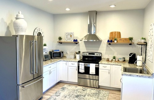 This is a two-story cottage with an open living/kitchen/dining area and 3/4 bathroom on the main level. In addition to your private BBQ Grill, the kitchen is equipped with a full-size refrigerator, stove, microwave, and Keurig, as well as all of the cookware and utensils you will need.