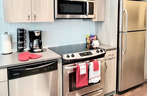 Our fully stocked kitchen features stainless steel appliances, including glass stove top oven, and is fully stocked with pots, dishes, silverware, glasses, cups, towels, and coffee maker. The cabinets are stocked with condiments such as variety of artificial sweetener and cream, salt + pepper, flour, olive oil and spices. The small dining table is perfect for two... just perfect for sipping your morning coffee and eating a hot breakfast or meal. The space also has in unit washer and dryer for your convenience.