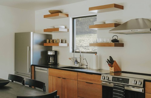Spend your day relaxing amongst aspen trees, a flowing creek, and stunning views of multiple mountain ranges. Enter through a laundry area with ample storage space for outdoor gear. A stackable washer/dryer is available and handy for those who pack light. An open concept living, dining and kitchen area separate the two bedrooms with en suite baths. Floor-to-ceiling windows bring the outdoors in. The kitchen is fully stocked with cookware, dishware and all appliances, making cooking a breeze. Sliding glass doors off the living area open to a spacious trex-planked deck with outdoor seating to take in the sound of the creek and views of nature.