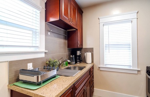 The Stylish South Park Studio By Balboa Park features elegant granite countertops, a fully equipped kitchen, a plush king-sized bed, and a tiled shower with a soothing rain fixture. Enjoy entertainment with a wall-mounted flat-screen TV equipped with Netflix, along with complimentary high-speed Wifi. Additionally, revel in the convenience of private in-unit laundry, available at no extra cost.