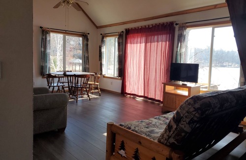 Our spacious 2-bedroom 1 bath + loft has become a guest favorite. Whether you are sitting on your deck or standing at your large window. You will have a spectacular view of the lake and the native wildflowers cascading down to the majestic lily pad garden. There is also a beach side fire pit at the lake front where you can watch the stars and listen to the loons of Hardy Lake. With central air, Smart TV, and a dishwasher, this cabin gives you a comfortable open airy space to rest and recoup after a long day in the sun.
