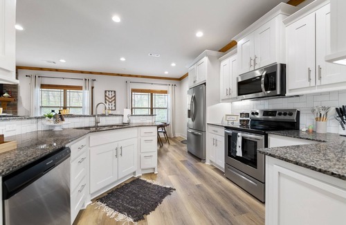 The Nelson- Close to Lake Windsor and miles of trails. This beautiful newer home is located in Bella Vista which is 8 miles from downtown Bentonville. Professionally decorated and appointed with everything you need. Enjoy the peaceful outdoors with the covered rear deck and additional backyard fire pit seating area. Enjoy playing corn hole or kicking the soccer ball. Plenty of room for your furry friends to run around as well. Relax with the whole family at this peaceful place to stay.