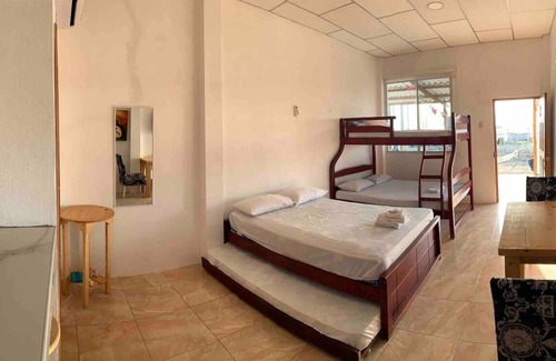 Amplia habitación cerca de la playa con dos camas individuales y una litera. Cocina completa, TV con Netflix, WiFi y aire acondicionado. Decoración moderna y acogedora. A solo pasos de la arena dorada y las olas del mar. El lugar perfecto para relajarse y disfrutar de unas vacaciones inolvidables.