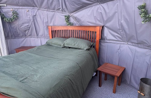 Welcome to your Glamping Experience!The Prairie Sage Dome is a peaceful retreat inspired by the soft greens of nature. Designed for those seeking relaxation and balance, it offers a calming ambiance that promotes mindfulness and rest. Inside, you’ll find a queen bed, seating for quiet moments of reflection, and a small table for snacks or games.Equipped with a heater, low voltagelights and phone charger, the Prairie Sage Dome combines simplicity with modern amenities.While this is a glamping experience, it still carries the essence of traditional camping—bathroom facilities are just a short walk (700-1200 ft away), allowing you to truly immerse yourself in the natural surroundings. Set within the tranquil landscape of Healing Grounds, this dome is a place to reconnect with nature and find your inner peace. Our cowboy kitchen offers a place to bbq and there is a small fridge that guests can share.