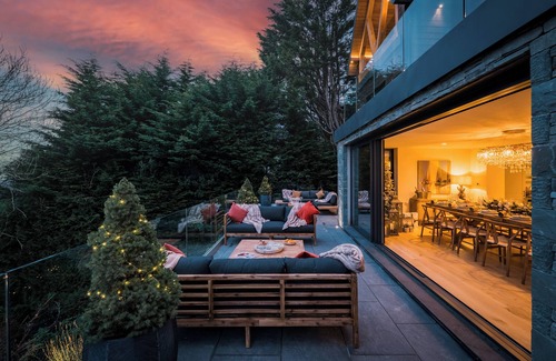 Ridge House consists of a kitchen with fridge, freezer, and two dishwashers, dining room, sitting room with Smart TV woodburning stove, sitting room with Smart TV, utility with two washing machines, two tumble dryers, fridge, and freezer, games room with pool table, cinema, and gym. Three-storey. Six bedrooms. 1 x super-king-size (zip/link can be twin on request) with Smart TV, balcony, double en-suite walk-in shower, double basin, heated towel rail, Freestanding bathub and WC. 1 x super-king-size (zip/link can be twin on request) with Smart TV, balcony and en-suite walk-in shower, basin, heated towel rail, and WC. 1 x super-king-size (zip/link can be twin on request) with Smart TV, Juliet balcony and en-suite walk-in shower, double basin, heated towel rail, freestanding bathtub and WC. 1 x second-floor super-king-size (zip/link can be twin on request) with Smart TV, balcony and en-suite walk-in shower, basin, and WC. 1 x second-floor super-king-size with Smart TV, balcony, and en-suite walk-in shower, basin, and WC. 1 x second-floor super-king-size (zip/link can be twin on request) with Smart TV, balcony, and en-suite walk-in shower, basin, and WC. Extra accommodation on sofa beds. Outside, there is a boathouse with mezzanine sofa bed, kitchen, bathroom, dining area, and outdoor shower, an enclosed rear garden with terrace, patio, barbecue, furniture, and fire pit, a boat house, an outdoor bathtub, an outdoor kitchen bar, and private driveway for six cars. Sorry, no pets and no smoking. WiFi, fuel, power, starter pack for woodburning stove, bed linen, and towels are all inc. in rent. Escape to Ridge House. Note: A mezzanine with sofa bed and TV is available. Note: All super-king-size beds are zip/linked. Note: This property can only accept bookings that start either on a Monday or on a Friday. Please note: this property has many steps and may not be suitable for those with mobility issues, and children must be supervised.