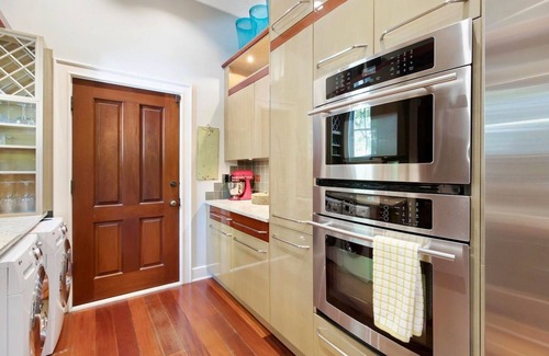 Inside, the main living area of THE ROYAL COMPOUND has four sets of French doors with large transoms that fill the whole space with light. There's also a large fireplace, unique in Key West. The formal dining table seats eight comfortably. A second sitting room is perfect if you want to be by yourself for a good read. The kitchen is state-of-the-art, and suitable for a professional chef, with double ovens, a huge Sub Zero fridge/freezer, ice maker and plenty of prep space.