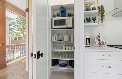 >Spacious, custom kitchen with luxury finishes, fully stocked with utensils and cookware