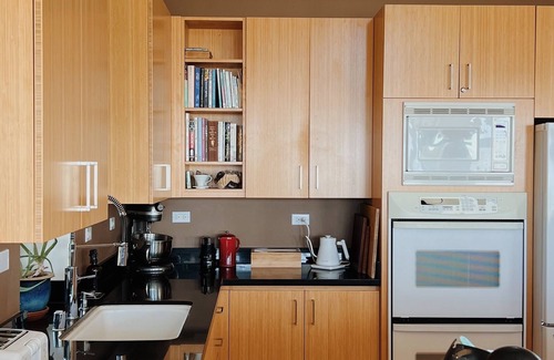 A gourmet custom granite and bamboo kitchen with double oven, All-Clad Cookware, dishwasher, Kitchen Aid mixer, InstantPot, VitaMix blender, 4-slice toaster, drip coffee maker plus french press, pressure cooker, salad spinner, pizza stone, baking pans and sheets, serving platters, and other kitchen items make cooking or baking a joy for small or larger groups.