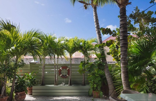 The two-bedroom apartment is directly above Sibarth’s office in Gustavia. It is one of the few remaining historical buildings in town, also known as La Maison Suédoise. Exclusively available through Sibarth, the luxury rental property is part of the Lacour family estate, which is comprised of several uniquely designed suites and apartments around a tropical garden in the heart of the city. This puts it within easy reach of Gustavia’s boutiques, bakeries, restaurants, and nightlife. Shell Beach is just around the corner.