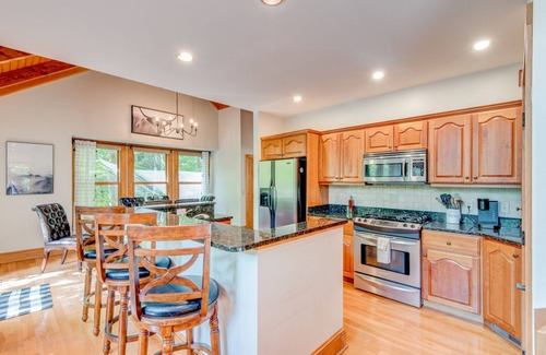 The main level hosts two bedrooms, including a master suite with a private bathroom and walk-in closet, and a second bedroom with a queen bed its own bath. The home exudes a mountain getaway ambiance with its tongue-and-groove cathedral ceilings, mountain accents, and abundant natural light filtering through the trees.