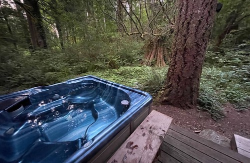 Relax and explore in a gorgeous mid century cabin nestled amongst the cedars and fir. The treehouse has big windows looking out at the forest to your private creek. It’s a lovely secluded one bedroom with a huge rock fireplace, reading nook, 100% organic cotton sheets, unscented eco friendly soap, and free internet. Take a hike down to the creek, or just open a window and let the babbling brook lull you to sleep at night. There’s nothing like watching the rain fall from your private hot tub.