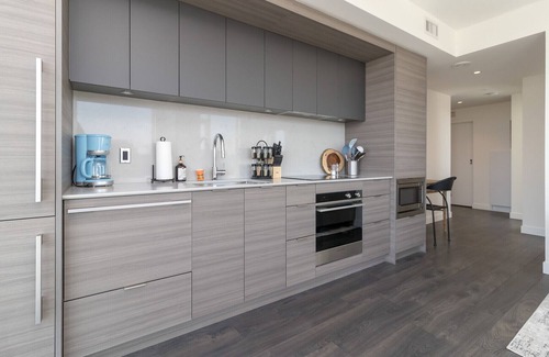 The designer kitchen consists of an induction cooktop, wall oven, Fisher Paykel dishwasher, build in fridge with freezer drawers, quartz counter, sleek Eurostyle cabinets, large built in pantry. The appliances in the accommodation are complemented by a Bosch washer and dryer. The bedroom has a queen size bed and the luxurious bathroom offers a deep soaker tub and heated tile floor. The accommodation offers plenty of storage space with a large closet in the entry hall where also the washer and dryer are located as well as a built-in closet in the bedroom.