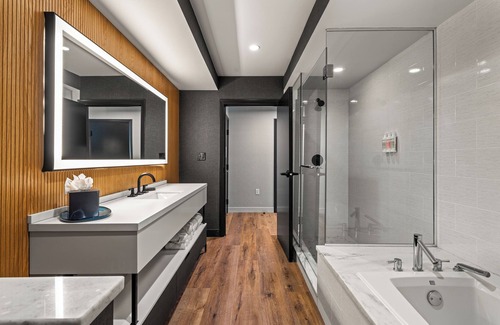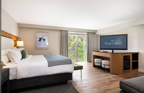 The Watershed offers 96 accommodations with laptop-compatible safes and designer toiletries. Beds feature premium bedding. 55-inch Smart televisions come with premium cable channels and Netflix. Bathrooms include showers with hydromassage showerheads, complimentary toiletries, and hair dryers.