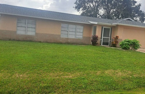This beautiful three bedroom two bath house is located in the heart of Palm bay Florida five minutes from shopping center, bars, restaurants, 1-95, twenty five minutes from the beach, and twenty five minutes from the Melbourne international Airport. This thoughtfully designed bring comfort for your family and friends.The master bedroom features a queen bed, dresser, bedside table, lamps with charging station ,walking closet and a private bathroom. The other two bedrooms features are queen beds, dresser, bedside table, lamps with charging statioThe full modernty equipped bathroom is located in the hallway serves these bedroom. For those needing a work space out home included a work area. The living area features a 55"smart TV for your entertainment. The kitchen is fully equipped and ready for your culinary needs complete with all the necessary appliances and utensils. The dining area is a hub of family fun stocked with board games ensuring entertainment for all guest. The patio is equipped with a grill and comfortable seating for a relaxing and social atmosphere. Our home is more than a place to stay it's thoughtful arranged design to make your visit to Palm bay Florida both comfortable and memorable. The entire house is available for you, families and friends to enjoy.