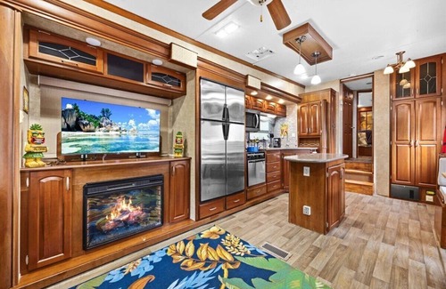 THIS IS AN AWESOME 36' RENTAL CAMPER WITH AMAZING LONG DECK, PLUS A SECOND STEP-DOWN DECK TO YOUR OWN PRIVATE HIDEAWAY TIKI BAR! A BEAUTIFUL HUGE LIVE OAK COVERS THE ENTIRE LOT SO IT'S ALWAYS SHADED, AND THIS EVEN COMES WITH A TABLE & CHAIRS FOR OUT is located in Milton. THIS IS AN AWESOME 36' RENTAL CAMPER WITH AMAZING LONG DECK, PLUS A SECOND STEP-DOWN DECK TO YOUR OWN PRIVATE HIDEAWAY TIKI BAR! A BEAUTIFUL HUGE LIVE OAK COVERS THE ENTIRE LOT SO IT'S ALWAYS SHADED, AND THIS EVEN COMES WITH A TABLE & CHAIRS FOR OUT provides accommodation, featuring Parking, Pool, Balcony/Terrace, among other amenities. This RV Rental features Parking, Pool, Balcony/Terrace, to make your stay a comfortable one.