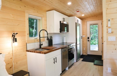 Perfect for solo travelers or couples, Timber Lodge features an open-concept layout with natural wood accents, a fully equipped apartment-sized kitchen with stainless steel appliances, and a cozy living area. The queen bed is fitted with a Douglas mattress and premium bedding, and the spacious tiled shower adds a touch of everyday luxury. Large windows frame forest views, while the private, cozy shaded deck is perfect for your morning coffee or evening wine.