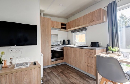"Tiny Haus Henry", 2-room mobile home 25 m2. Object suitable for 2 adults + 2 children. Cosy furnishings: living/sleeping room with 1 double sofabed (140 cm, length 200 cm), satellite TV. 1 room with 1 french bed (140 cm, length 200 cm). Open kitchen (oven, Gas stove, 2 gas rings, kettle, electric coffee machine, Capsules for coffee machine (Nespresso) extra). Shower/WC. Gas heating. Small terrace. Terrace furniture, barbecue (portable). Parking at 50 m. Please note: non-smoking house.