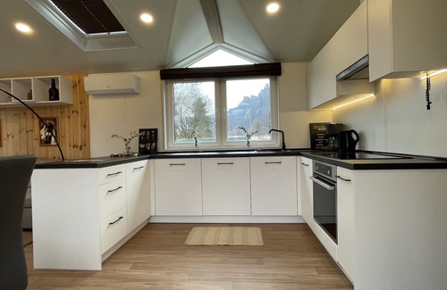 "Tiny Haus Prinz Ludwig", 3-room mobile home 48 m2. Object suitable for 2 adults + 4 children. Comfortable furnishings: living/sleeping room with 1 double sofabed (160 cm, length 200 cm), Scandinavian wood stove (only for decoration), satellite TV and air conditioning. Exit to the terrace. 1 room with 1 french bed (160 cm, length 200 cm). 1 room with 2 beds (80 cm, length 200 cm). Open kitchen (oven, dishwasher, 4 ceramic glass hob hotplates, kettle, electric coffee machine). Shower, sep. WC. Small terrace. Terrace furniture. View of the river. Facilities: washing machine. Parking at the house. Please note: non-smokers only.