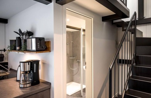 "Tiny Haus Westerwald 16 Green", 1-room house 28 m2. Modern and cosy furnishings: living/dining room, on 2 levels with TV. Exit to the terrace. Open gallery with sloping ceilings, ceiling height 1 - 120 cm, without wardrobe with 1 double bed (160 cm, length 200 cm). Kitchenette (2 ceramic glass hob hotplates, toaster, kettle, electric coffee machine). Shower/WC. Terrace. Terrace furniture. Parking at the house. Please note: non-smoking house. Smoke alarm. Instead of an enclosed bedroom, some sleeping areas are located in an open-plan area (gallery, alcove, etc.).