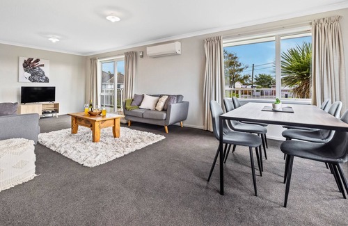 This three-bedroom Christchurch holiday home sleeps up to six guests. Enjoy the comfort of a California-king and super king-size bed, while the third bedroom is comprised of two singles. The spacious family bathroom with an accessible wet-area shower, additional separate toilet and laundry with full facilities complete the set-up of your stay.