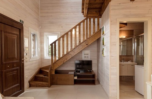 On the mezzanine there is the bedroom and the bathroom. The ground floor of each villa has a living room with a kitchen and a toilet. The sofa can be converted to a standard double bed or two single beds. It is an independent fully equipped and functional country house (washing machine, dishwasher, ceramic cooker, oven, microwave, refrigerator large capacity), with complete equipment, air conditioners, solar heating, television and satellite internet .