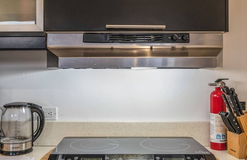 A separate entrance is a portal to a luxurious self-contained modern cottage in a secluded walled garden. Sliding glass pocket doors look over the lily pond and hummingbirds. The tree-shaded bedroom has cork floors for quiet comfort and a sliding wood panel door. The bathroom has a shower with floor to ceiling frosted windows, and there is a private rear deck. This contemporary modern suite features vibrant colors and artwork throughout. We provide fragrance free soaps and cleaning supplies and HEPA AIR FILTRATION 24HRS.