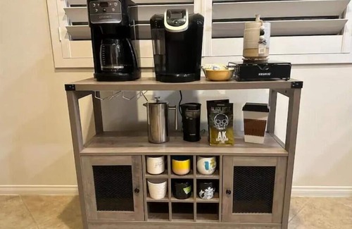 · Fully stocked kitchen: large coffee and tea bar, pots, pans, blender, popcorn popper, spices, toaster, plates, glasses, silverware, and cooking utensils