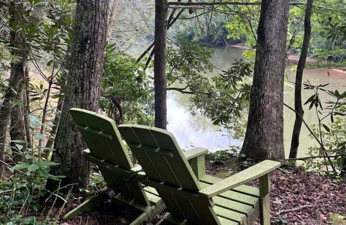 Discover an escape at our riverside glamping treehouse nestled by the Chestatee River. Perfect for families or friends seeking adventure and relaxation, this thoughtfully designed space accommodates up to 5 guests. The cozy yet spacious layout features a luxurious queen bed and three twin beds, ensuring everyone enjoys a restful stay. Cast your line for a fishing session or take a refreshing dip in the river's cool waters. As the sun sets, the magic continues as you gather around the fire pit by the water's edge, sharing stories and laughter under the starlit sky. Unwind in nature's embrace without compromising comfort.