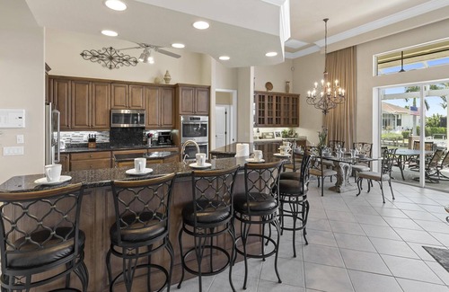 The gourmet kitchen, equipped with stainless steel appliances, custom cabinets, and a breakfast bar, flows seamlessly from the living room. The formal dining room offers a great place to enjoy a quick breakfast before hitting the beach, and you can use the full-size refrigerator, stove, microwave, and other kitchen gadgets to cook a meal to enjoy by the pool.