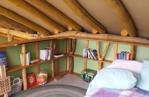 The cabin is a green home with uncompromising beauty and energy efficiency. It has a prefabricated round-timber frame and pallet-wall system. The living/dining/kitchen area has a 14’ high ceiling, with dramatic branching timber columns and beams. White oak slab tables and counters add timeless beauty. The custom red oak stairs and railing with buckthorn stiles flows up to the bedroom/loft. The house’s gently curving roof opens up to the south to maximize winter solar heat.