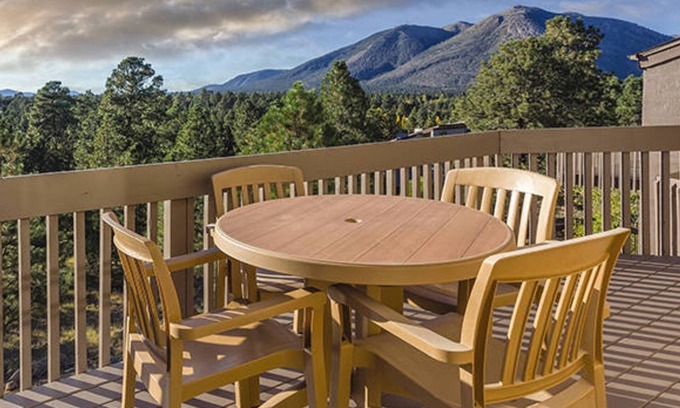 At Club Wyndham Flagstaff, these spacious one- and two-bedroom resort suites comfortably sleep four to six guests and range from 460 to 963 square feet. Suites feature one king bed in the master bedroom, two twin beds in the guest room and a sleeper sofa in the living area. Whether you're traveling with extended family or a smaller party, you will appreciate the privacy of separate bedrooms, the economy of a fully equipped private kitchen, and the convenience of a washer/dryer in each suite. Plus, a whirlpool tub, full dining room, and TVs throughout are comforts you just won't find in an average hotel room. Enjoy a hot cup of cocoa by the fireplace or take in the fresh air and mountainside scenery from the comfort of your own private balcony in this relaxing, vacation destination home.