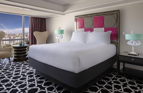 This renovated 350-square-foot non-smoking room has two queen beds and a chaise. Amenities include a 55-inch HD TV, rain shower and sophisticated bathroom fixtures and lighting. The center Strip location makes this Vegas room even more enticing. Stay center strip at the forever fabulous Flamingo Las Vegas Hotel and Casino. Now featuring newly renovated Flamingo Rooms that have a mix of classic Vegas with up-to-date style. The neon lights and tropical ambience of the Flamingo Las Vegas have made it an instant classic. Opening in 1946, the Flamingo is the soul of the Vegas Strip pioneering the idea of a resort in the desert. Today guests enjoy a lush 15-acre pool with wildlife area and live flamingos, spa, multiple restaurants and bars and entertaining shows. Chic, contemporary rooms are adorned with vintage Vegas artwork and flamingo-pink accents.This resort charges a mandatory resort fee, due upon arrival upon check-in. This resort fee is required, regardless of utilization. In addition, valet and self-parking fees will be charged upon utilization. Both Parking and Resort Fee pricing are subject to change at the properties discretion.Please be advised that the Flamingo Las Vegas pool will be open for the season starting March 17, 2025 from 9am PST - 5pm PST. Effective October 31, 2025, the pools at Flamingo Las Vegas will be closed for the season (subject to change).