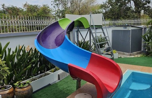 For the swimming pool, 7 life jacket ,fancy rubber ring…… toys for swimming pool, 3 sun lounges with cushions and umbrella pool slide, (1 fridge and 1 set of stereo next to the area of swimming pool) bird nest swing and free wifi available around the property.