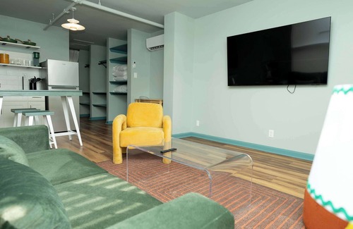 Umbra is a stylish bachelor suite with sleek stainless-steel details, a Murphy bed, and a bold, playful design. A perfect retreat for innovators and free thinkers in Louisville’s trendy NULU district.