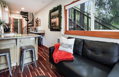 Welcome to Highland & Company Acres—your chance to stay in a one-of-a-kind 480 sq. ft. shipping container home, thoughtfully designed and nestled on our serene 10-acre sustainable homestead. Enjoy a peaceful escape surrounded by nature, with Scottish Highland cattle grazing just outside your window. From the cozy loft bedroom, you can take in valley views and watch the Highland coos right from bed. The loft is accessed by a spiral staircase inside, or an exterior staircase leading to the upper deck—your choice! Inside, you’ll find a fully stocked galley-style kitchen with stainless steel appliances and granite countertops. The spacious bathroom features a tile shower with a rainshower head, and a large closet houses a convenient all-in-one European-style washer/dryer. Unwind in the inviting living area with 9-foot ceilings and an electric fireplace, or head outside to enjoy both a traditional fire pit overlooking the valley and a gas fire pit on the scenic deck. Whether you’re watching the sunset, sipping coffee with the cows nearby, or stargazing by the fire, this unique farm stay offers the perfect mix of comfort, charm, and connection to nature.