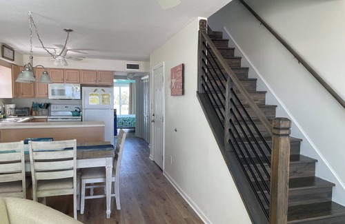 Upstairs features a king master bedroom and a second bedroom with a bunk bed and queen along with a shared bath.