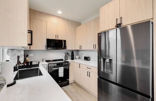 The pristine kitchen comes equipped with a range of stainless-steel appliances and spacious countertops, ensuring everything you need is there as you create delightful homemade dishes.